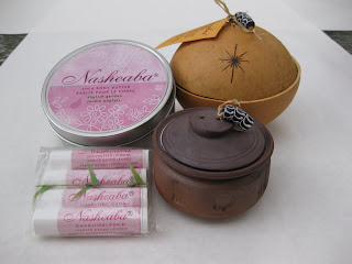 In my classes I teach about the importance of buying fair trade ingredients especially shea butter. Buying fair trade shea butter pays the women fairly for their hard work. I wanted to visit Ghana to meet these women and watch how they make shea butter starting with the karite tree. Instead, I was fortunate to have them come to me via Comfort. Comfort brought a DVD with slides of the women making the shea butter. She also brought shea butter, lip balms and beautiful beaded jewelry (I am wearing the necklace) in the photo. I love and treasure everything she gave me especially the shea butter in the gourd with a decorative bead and wood burned design and the clay pot with decorations on the side.